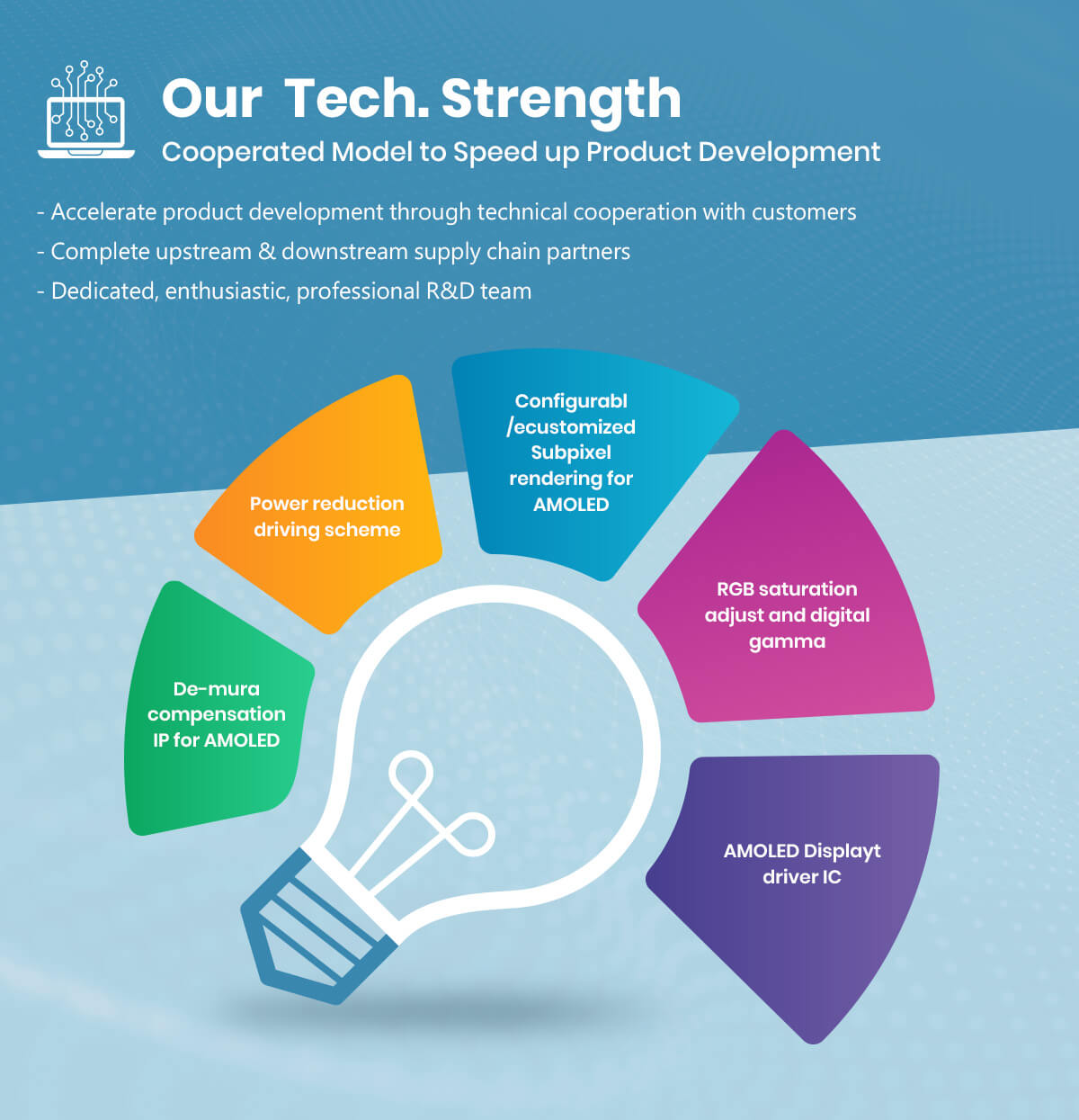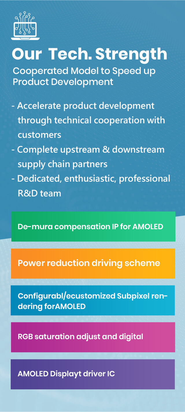 Ultradisplay Incorporation, established in 2017, is a fab-less IC design company. Ultradisplay plans to begin the market from AMOLED DDIC for smartphones, and offers a technical team with "display driver chip development capabilities and familiar IC design" to ensure the company is able to take the lead in the future of the huge AMOLED DDIC market & achieve success, moving towards the next generation of display technology.